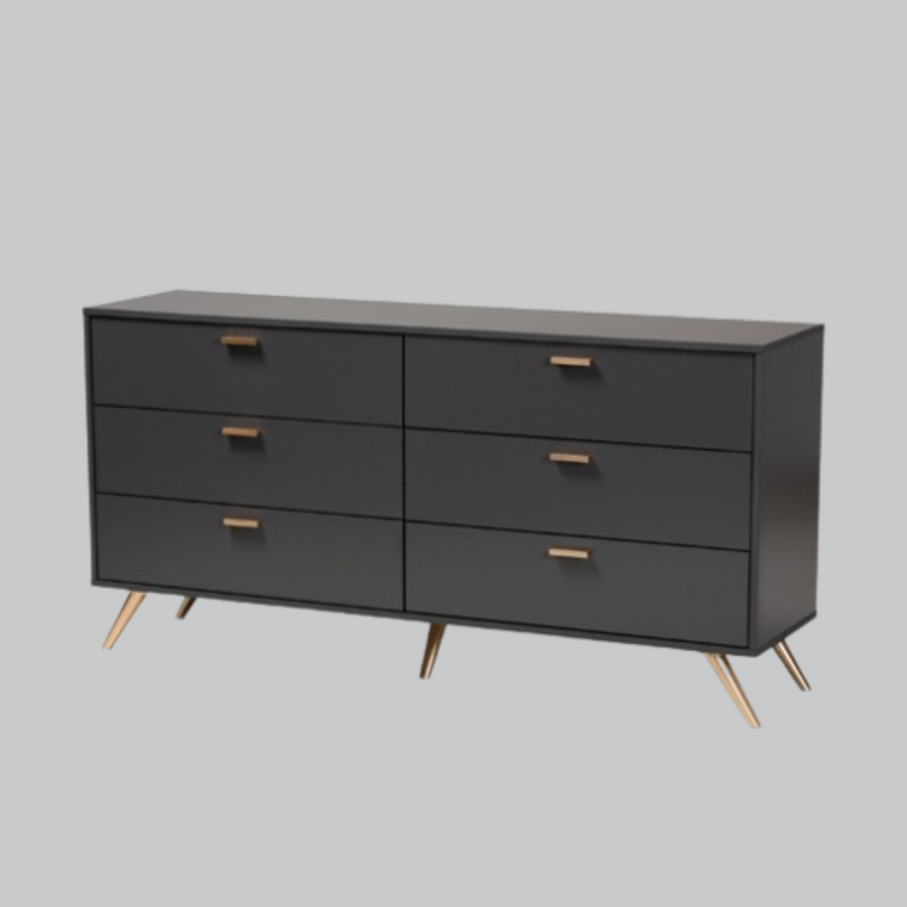 Our Addison Gold Finish Dresser is an elegant and sophisticated piece of modern luxury. Finished in gold with gold legs and gold handles that stand out against the dark grey color, this dresser is perfect for any room. With six drawers, it's easy to assemble and offers plenty of space for storage.