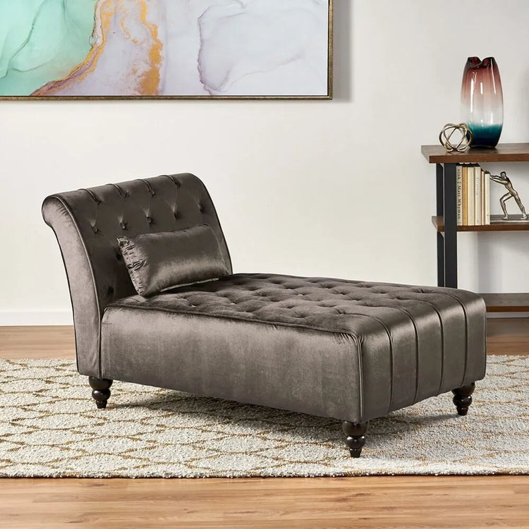 Introducing the Alice Velvet Chaise, a perfect blend of luxury and modern design. This velvet chaise is hand tufted with added pillow, and foam back-fill material that is designed for extraordinary comfort. This lounge chair is the perfect addition to any living bedroom or office setting.