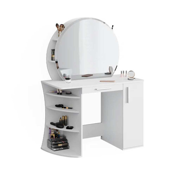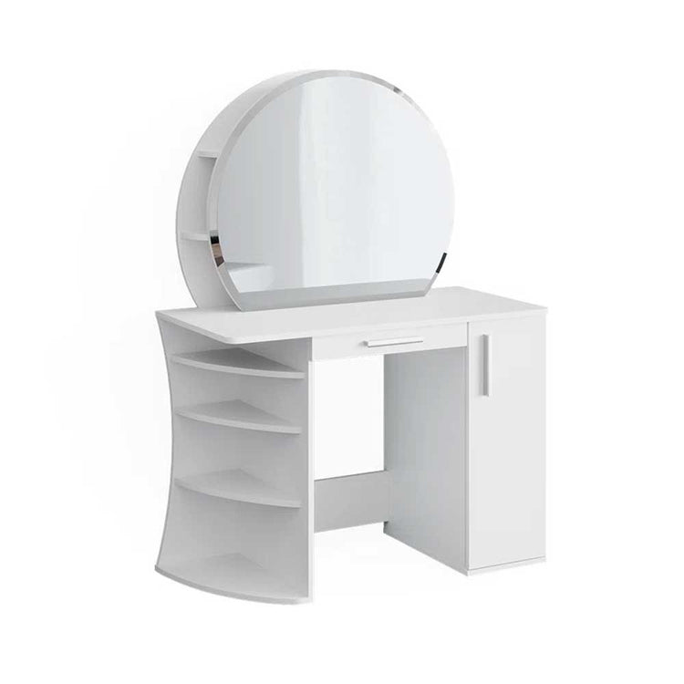 The Bali Dressing Table with Mirror adds a touch of luxury and practicality to any bedroom. Its classic and timeless design features a round mirror for a full-length reflection, plus open shelves and a two-shelf cabinet for organized storage of beauty essentials. Built with sturdy construction and fine craftsmanship, this dresser and mirror set exudes sophistication and a lasting elegance.