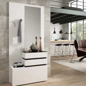 Elevate your hallway with our sleek and versatile Bluff Compact Hallway Cabinet. This luxurious unit offers four drawers for all your essentials, and a spacious shoe cabinet with metal tubes, perfect for 8-10 pairs of shoes. Finished with a black glass top and a stunning wall mirror, this unit brings both practicality and elegance to your space. Upgrade now and add a touch of exclusivity to your home.