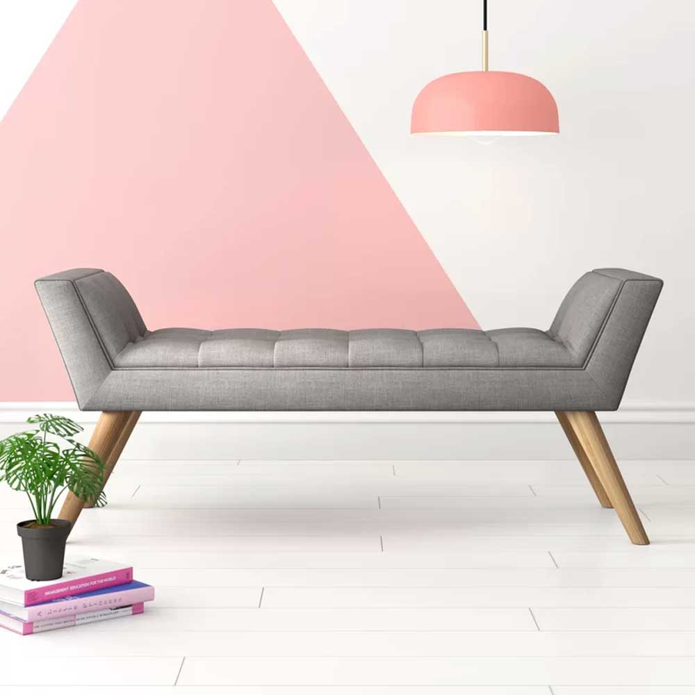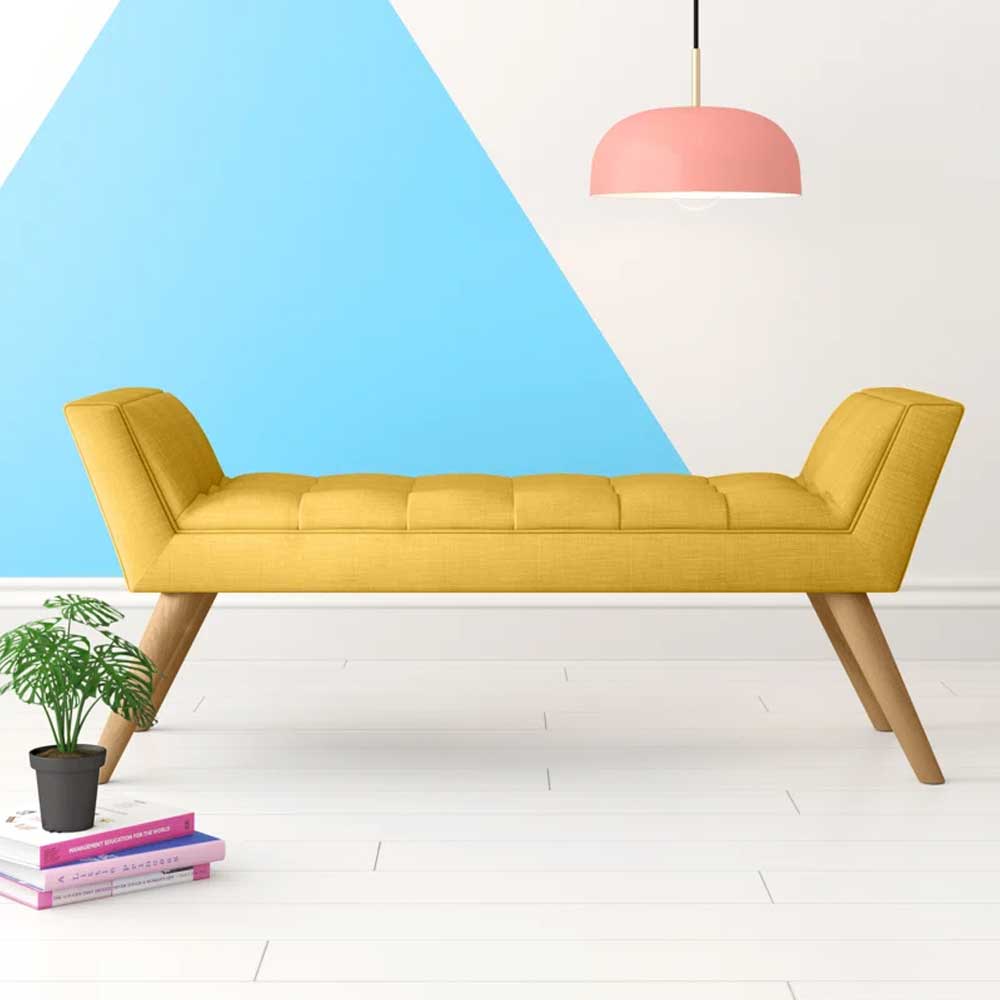 Upgrade your home with the Bonnie Upholstered Bench, a modern and functional occasional seat. Perfect for seating up to two people, this backless, flared-arm bench offers fashionable personality and comfort with its tufted, padded woven fabric upholstery. Upgrade your style with this must-have piece today.