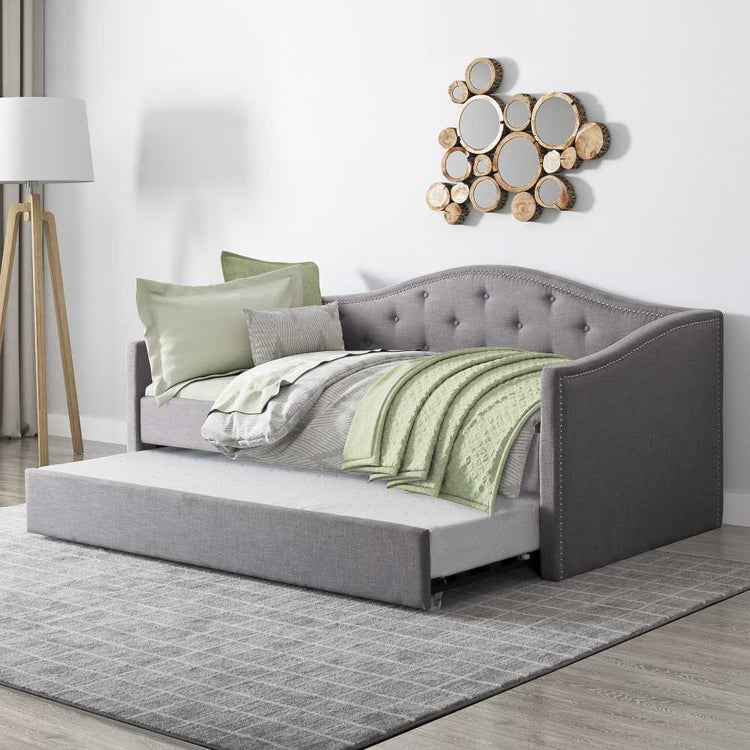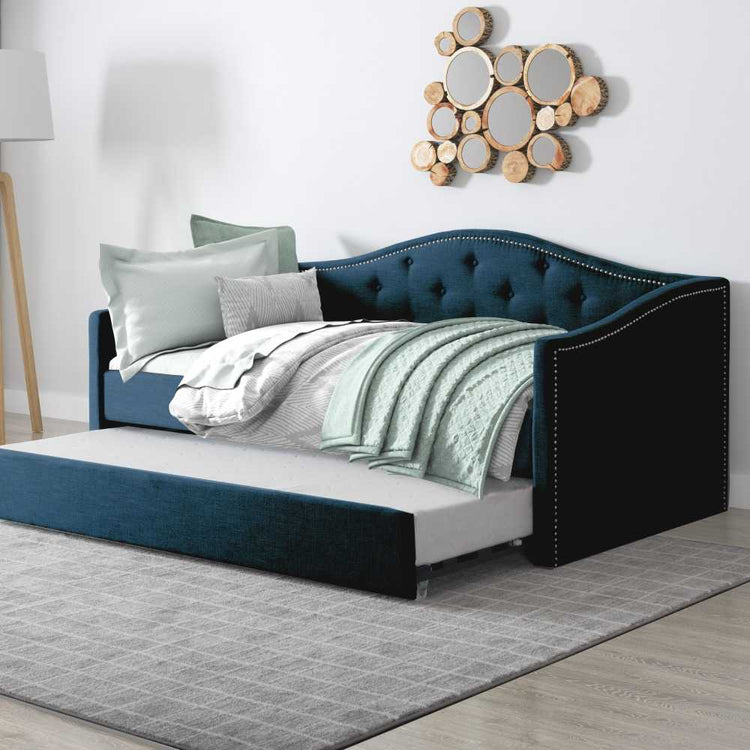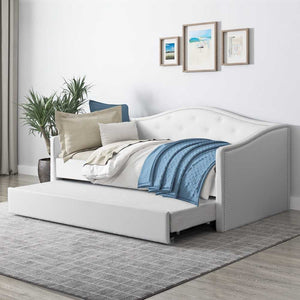 Experience the luxury of hosting overnight guests in style with the Luxemburg Daybed with Trundle. Elegantly detailed with tufted backboard, nailhead trim, and timeless silhouette, this daybed set will provide a sophisticated and exclusive look to your room. Its convenient trundle will provide a comfortable sleeping area for sleepover guests or visiting relatives.