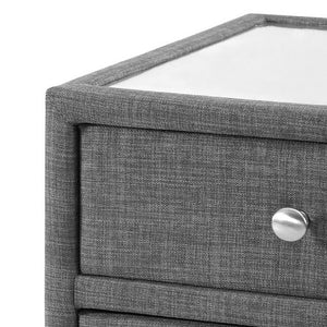 Be charmed by the graceful elegance of the Clara Nightstand. This modern piece of furniture is carefully crafted in sumptuous grey fabric, creating an inviting atmosphere in the bedroom. With its three drawers, the Clara is perfect for keeping bedrooms free from clutter, providing a dedicated place for your bedside lamp, alarm clock and mobile phone. The Clara Nightstand is a tasteful addition to any bedroom.