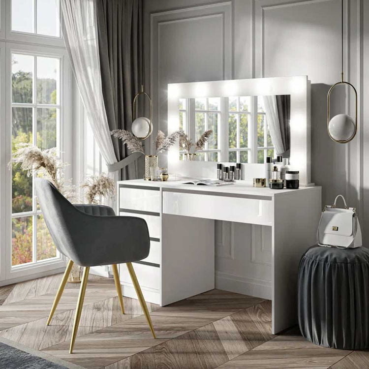 Featuring an exquisite snow-white color and sleek design, our contemporary Elegant Dressing Table is the perfect addition to any modern and stylish home. It offers four spacious drawers and an elongated drawer, providing ample storage space for all your cosmetics and accessories. For a touch of extra glamour, our set includes a large rectangular mirror accompanied by a captivating garland of light bulbs - perfect for a superior morning routine. This top-of-the-line product is a timeless piece that exudes elegance and indulgence.