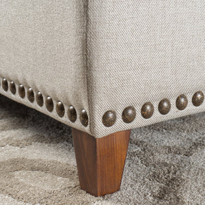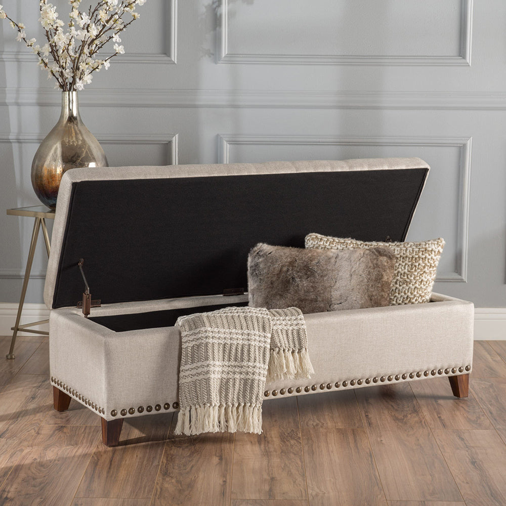 A combination of timeless comfort and stylish convenience, the Daphne Tufted Storage Bench is crafted from MDF select hardwoods. With a luxurious polyester blend fabric, silver tone nail head trim, and a button-tufted hinged lid, its timeless design is perfect for any modern home. Open the lid to reveal a spacious storage area and experience effortless elegance.