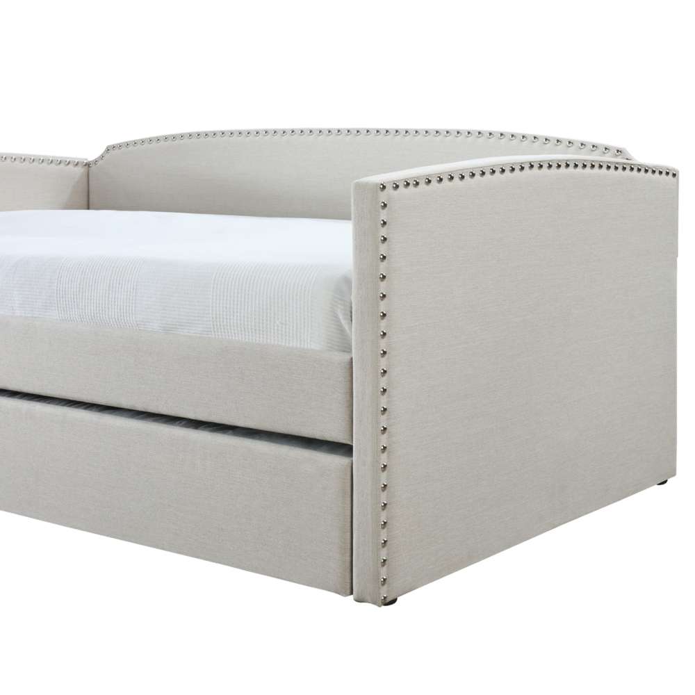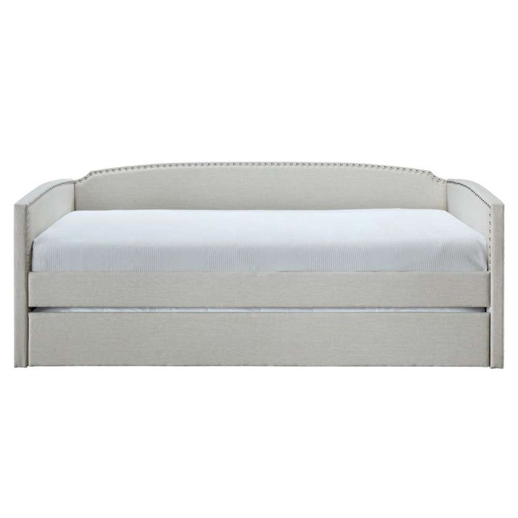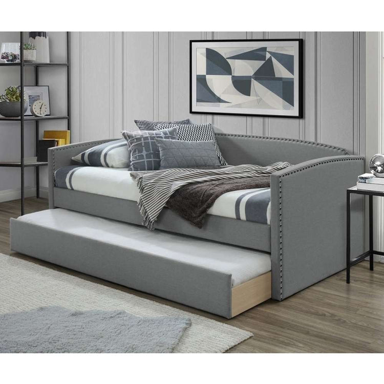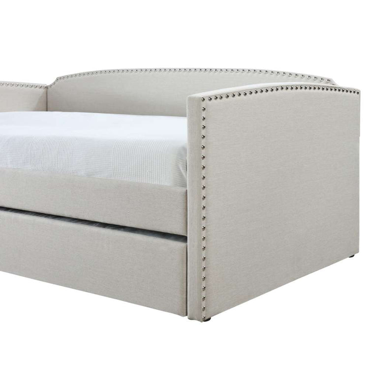 The Dina Daybed is an elegant and transitional piece of furniture that provides sophisticated style in any room. This daybed features a soft grey or beige linen-blend fabric, a slightly curved silhouette, and oil rubbed bronze nail head trim for a luxe finish. The pull out twin trundle bed offers an extra sleeping solution for when guests come over. Perfect for softening any space with a touch of premium luxury.