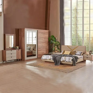 - Five-piece bed set that includes a bed, two night stands, a dresser, and a mirror