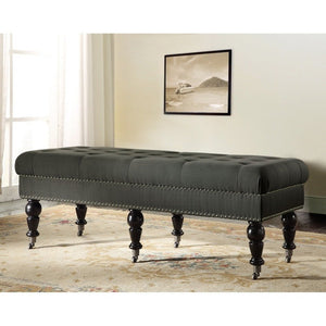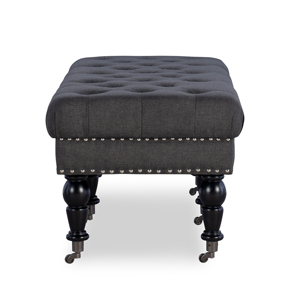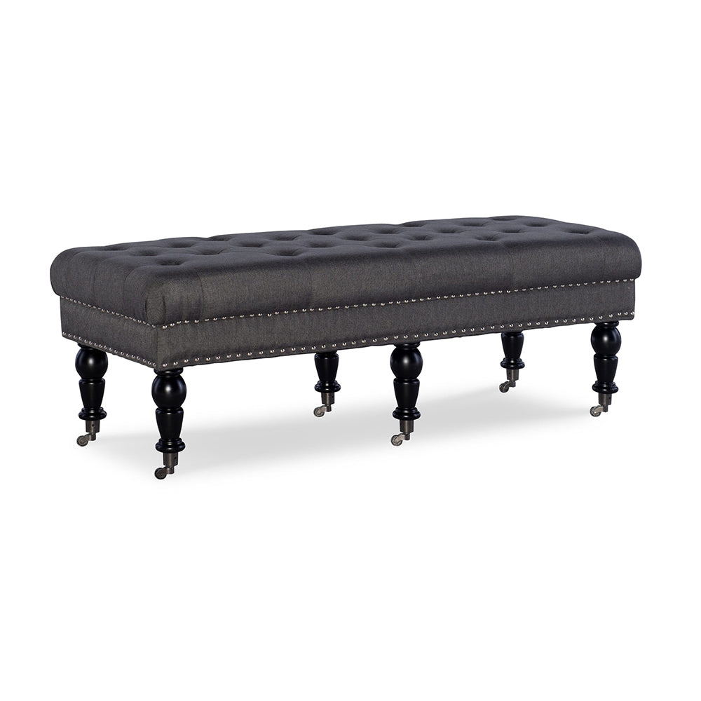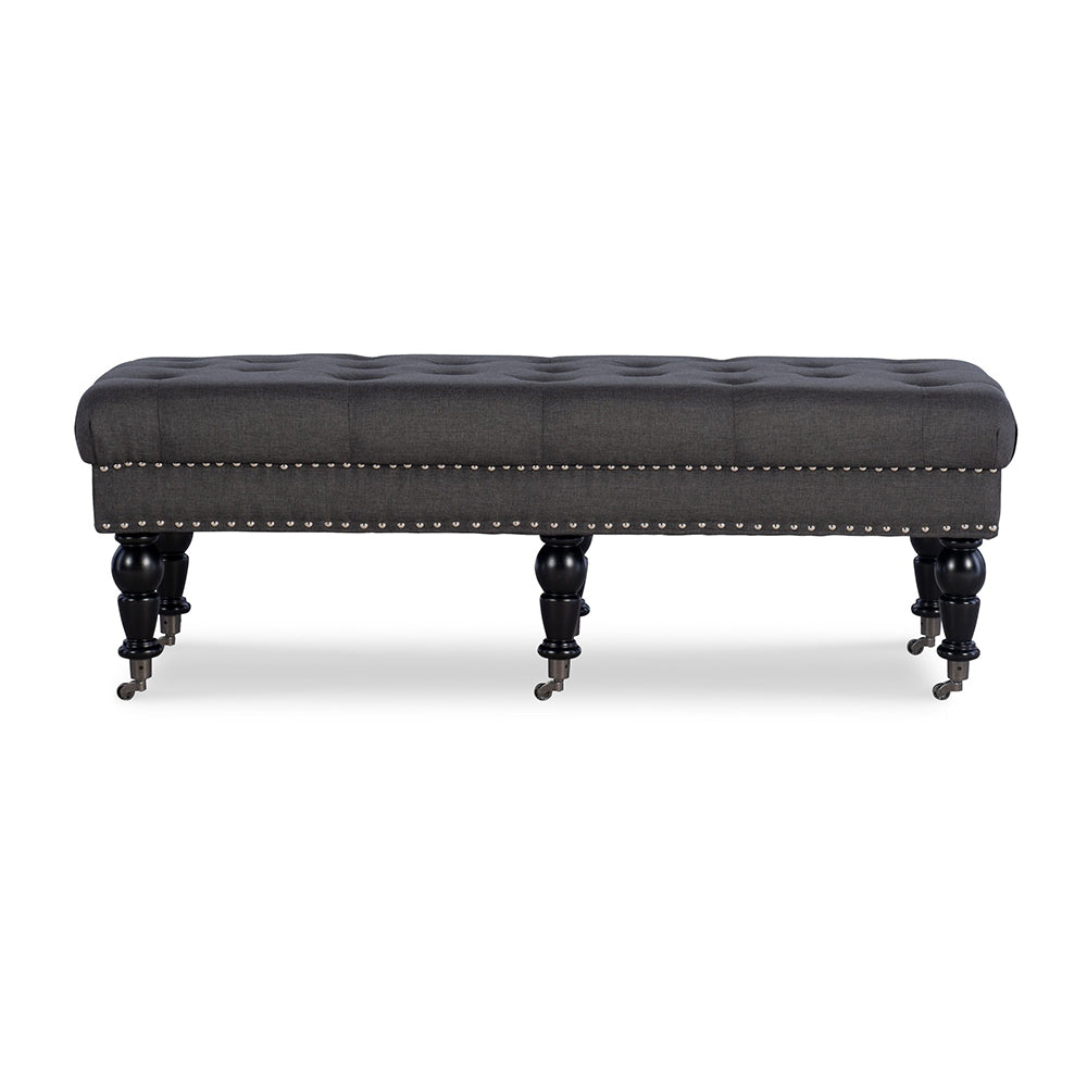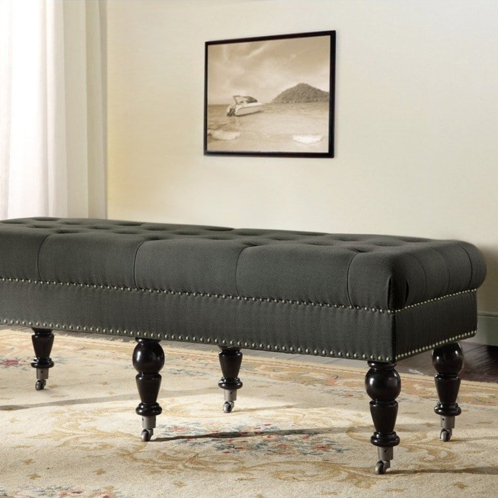 This Layali Tufted Bench is a stunning blend of comfort and sophistication, upholstered in luxurious charcoal linen and complete with espresso wood-finished legs for a truly elegant touch. Its thick padding ensures supportive relaxation, creating a timelessly refined look perfect for any home.