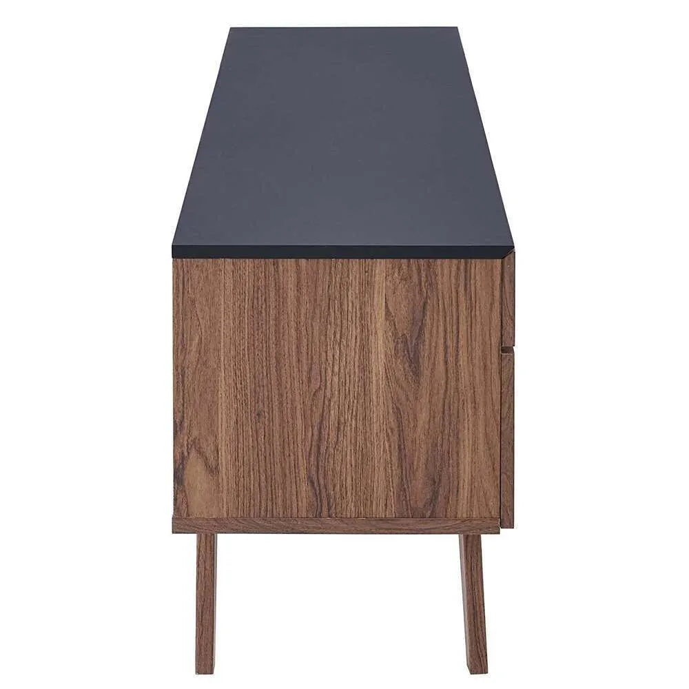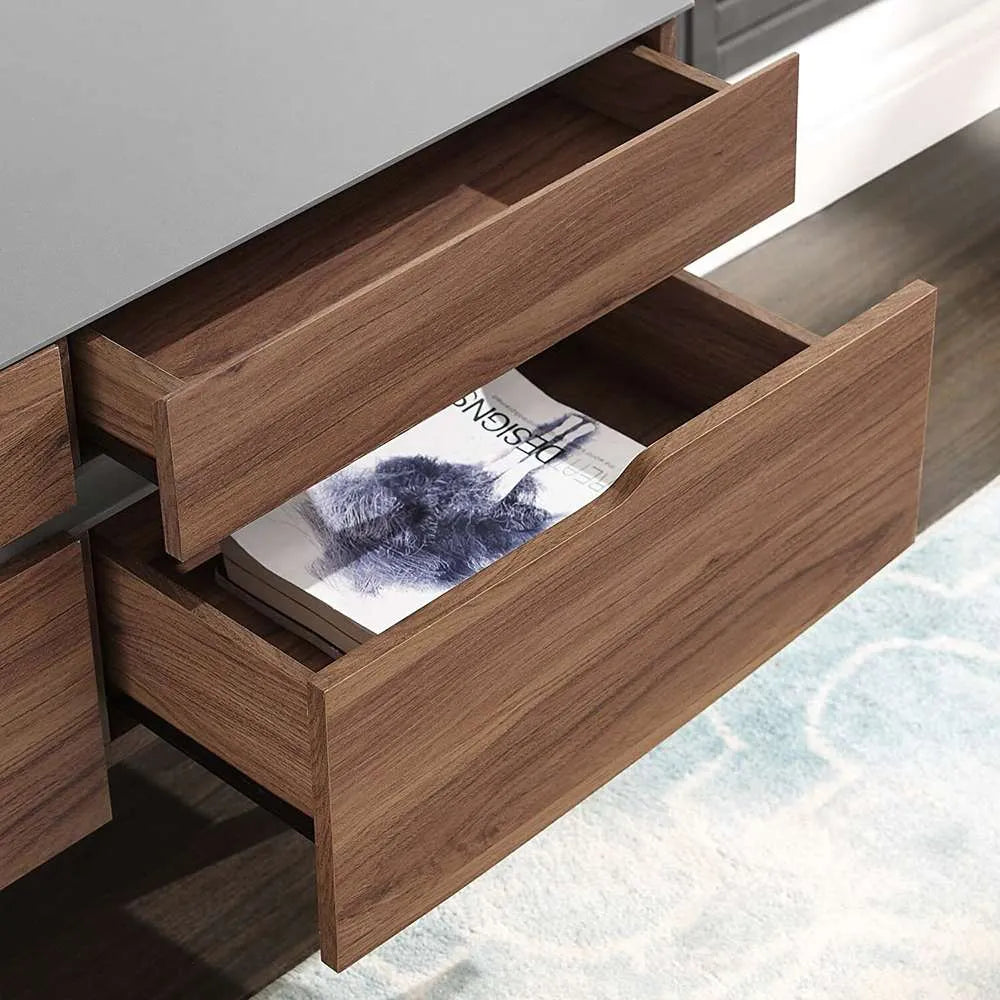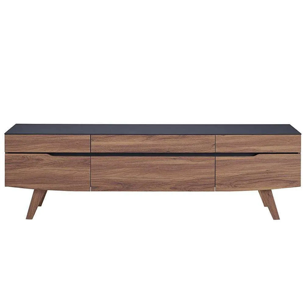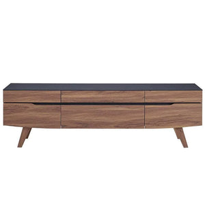 Elevate your living area with the luxurious Levi TV Stand. A modern masterpiece, it showcases a linear silhouette with smooth walnut grain laminate, a durable particleboard frame, contrasting gray lacquer accents, and six full-extension drawers for stylish media storage. Sleekly designed with crisp lines and edges, Levi adds a touch of sophisticated mid-century glamour to your space.