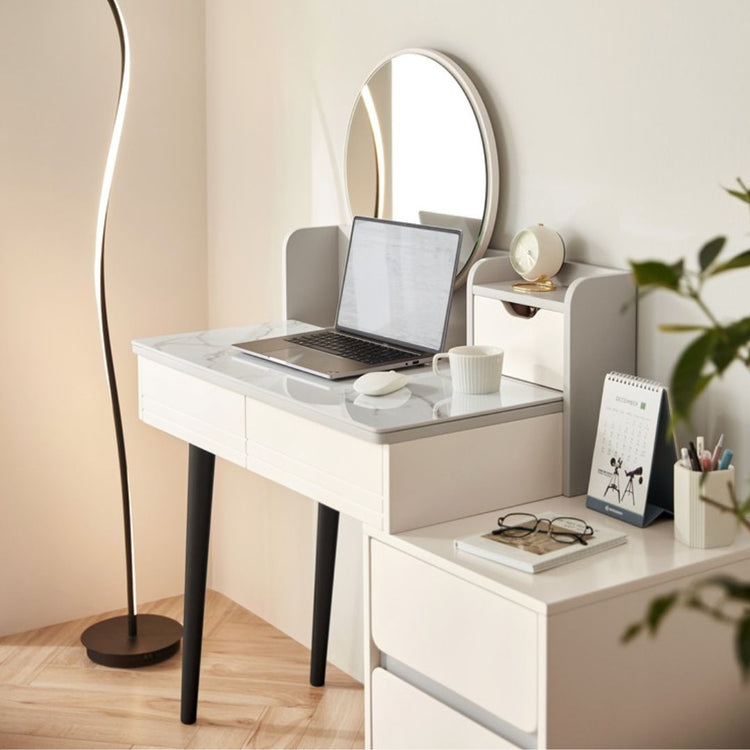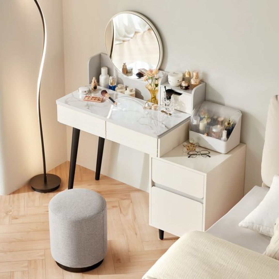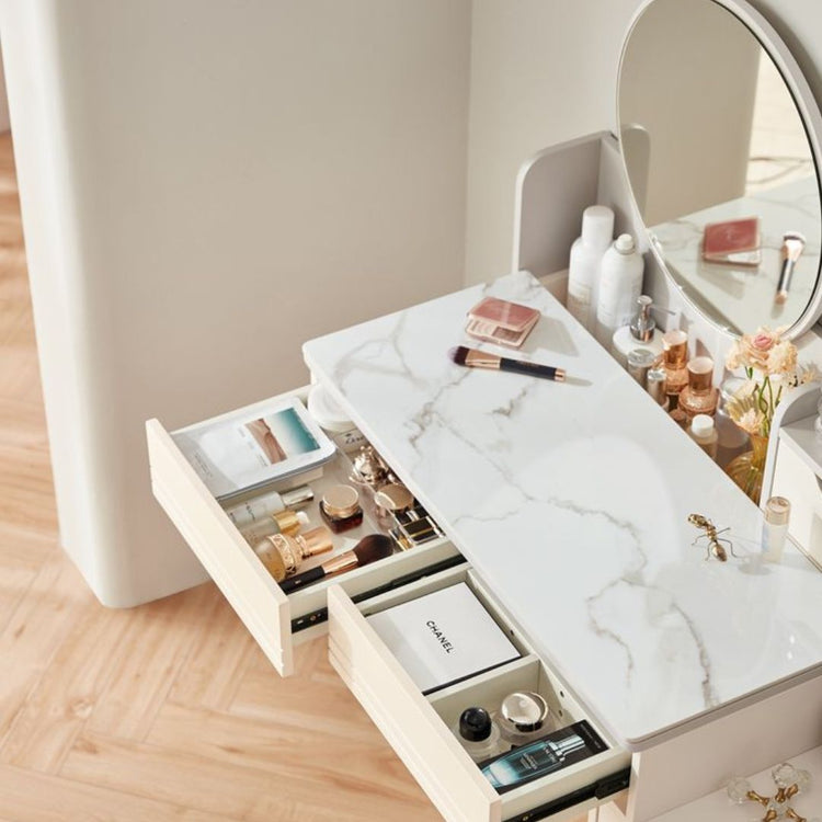 Inspire your living space with our Lisbon Dressing Table Set. The grey and white marble table top adds a touch of modernity to any room. Designed in a contemporary Nordic style, this set includes a matching stool and mirror for a complete, cute look. Elevate your daily routine with this stylish addition!