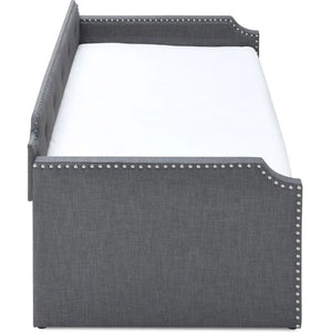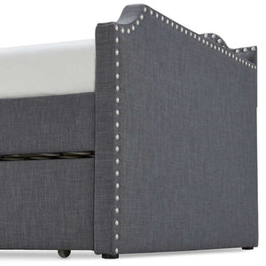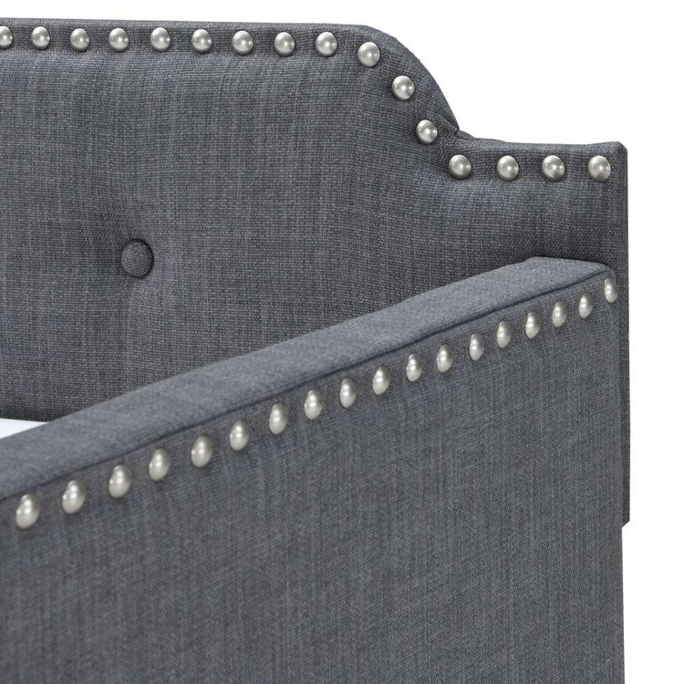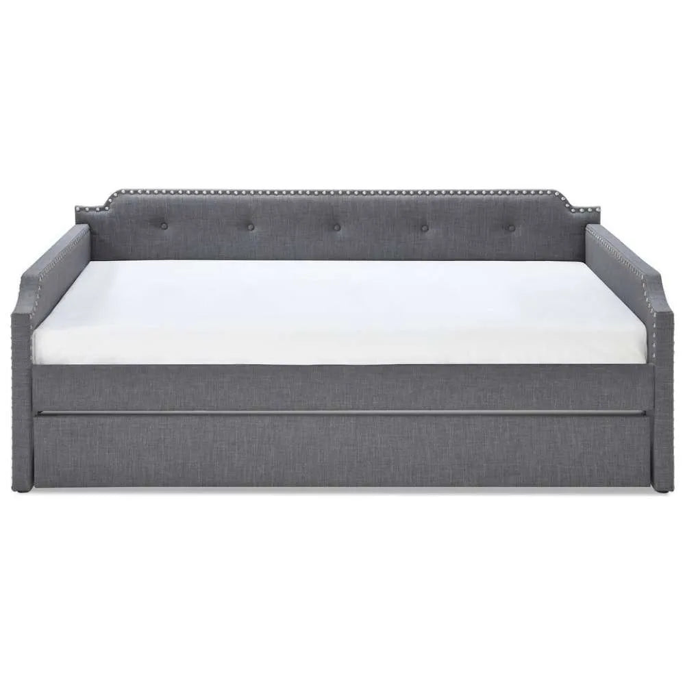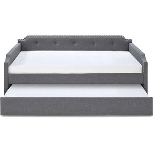 The Livingstone Daybed is a stunning piece of furniture with its upholstered frame and stud details. The perfect modern addition to any living space, the Livingstone Daybed is equipped with a pull out trundle, ensuring your guests will sleep comfortably. The tufted design and classic style make this the perfect daybed for any living room or guest bedroom.