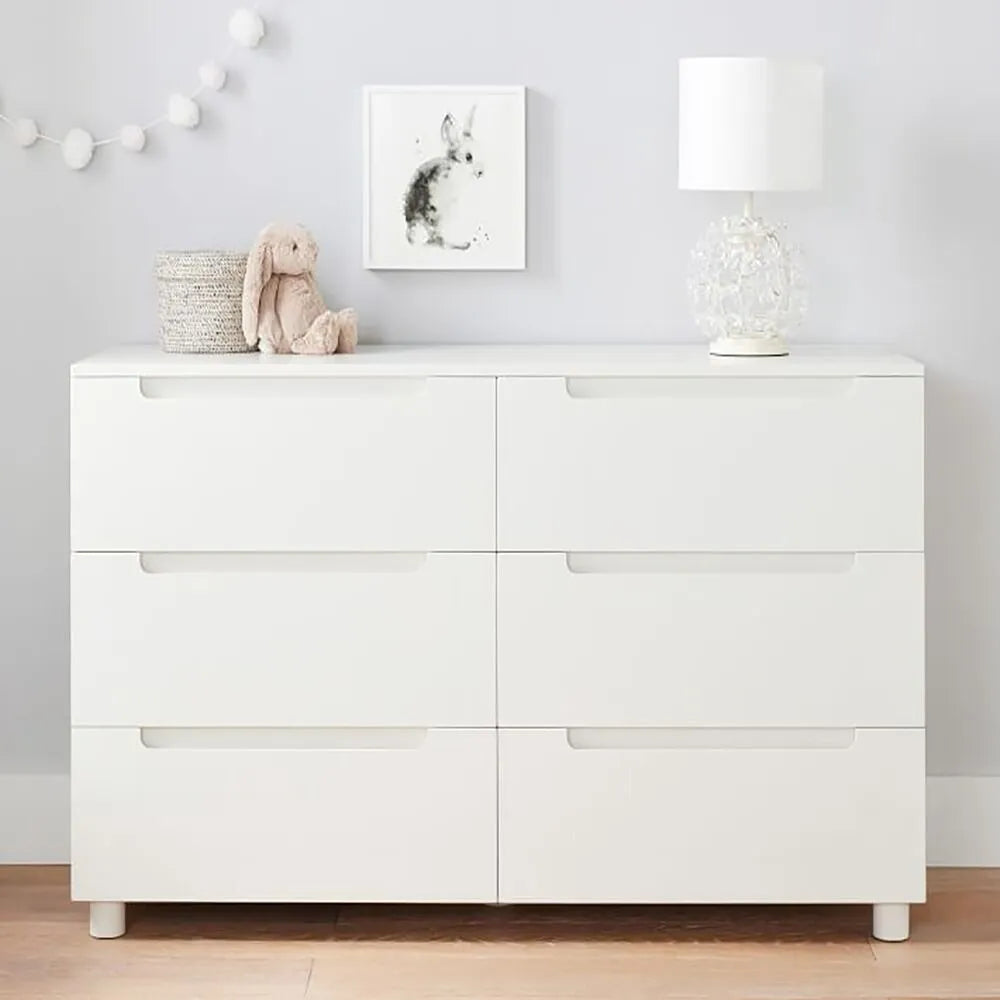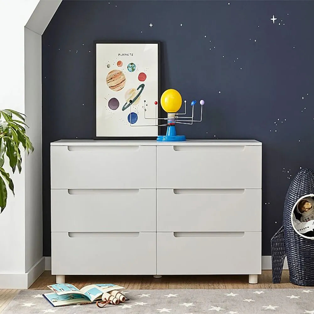 The Lola Wide Chest of Drawers is the perfect addition to any bedroom. With its modern and sleek design, this white chest of drawers features 6 drawers and wooden legs, offering both durability and style. Each drawer is designed with detailed joinery and glides to ensure smooth motion and a sophisticated look. Perfect for both adults and children's bedrooms, this sturdy and elegant chest will bring a unique and luxurious touch.
