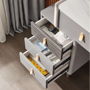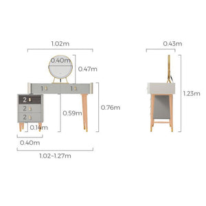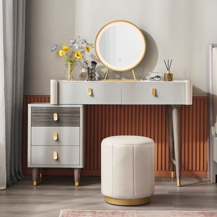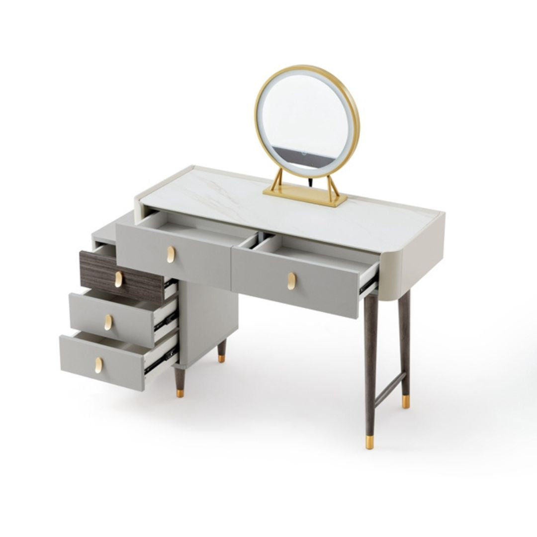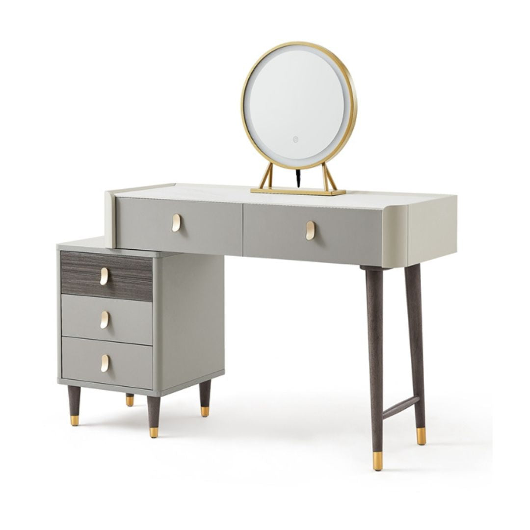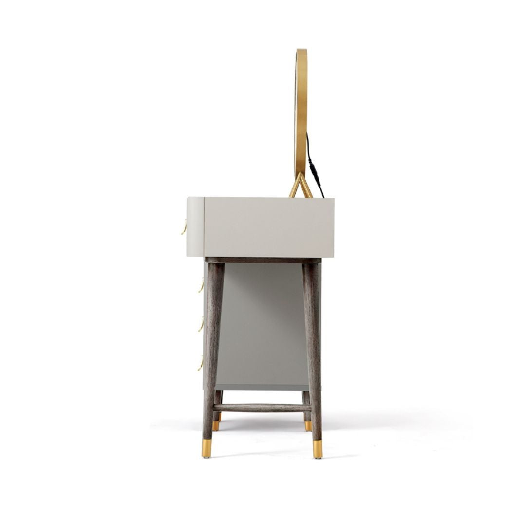 Elevate your daily routine with our Madrid Dressing Table Set. The modern and contemporary design, featuring grey and white wooden accents with elegant gold details, adds a touch of luxury to your space. Complete the look with a round mirror and a comfortable faux leather stool. Experience minimalist style at its finest!
