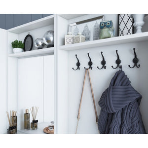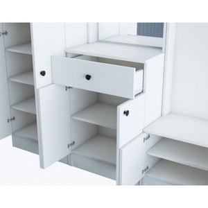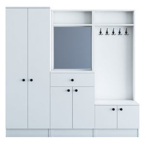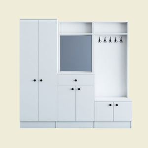 Introducing the Moseley Storage + Shoe Cabinet - the ultimate solution for a tidy and stylish home. This Scandinavian-style wardrobe set features integrated compartments, a bench chest, coat rack, cabinets, drawers and more, providing ample storage space while maintaining a modern design. Keep your space organized with this luxurious addition.