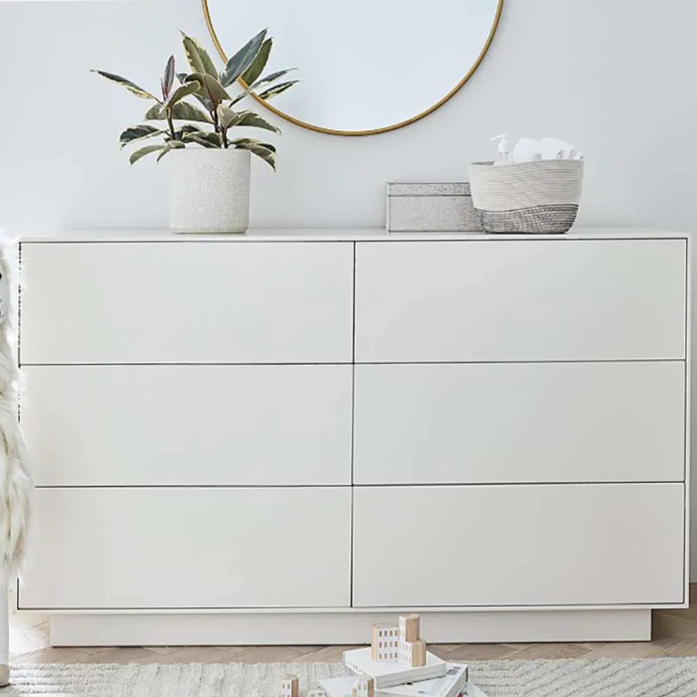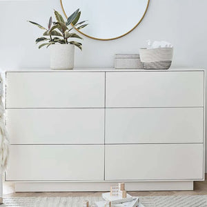 The Naomi Wide Dresser is the perfect way to make a sophisticated, modern statement in any bedroom. Crafted with six handleless drawers and a sleek white finish, this dresser offers ample storage space while maintaining a timeless aesthetic. An ideal addition to any stylish living space, this white wide dresser conveys a polished, refined look.