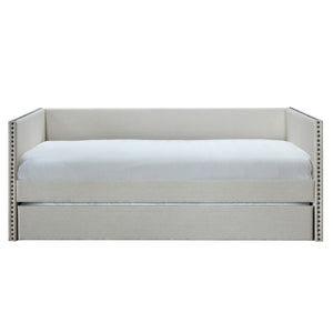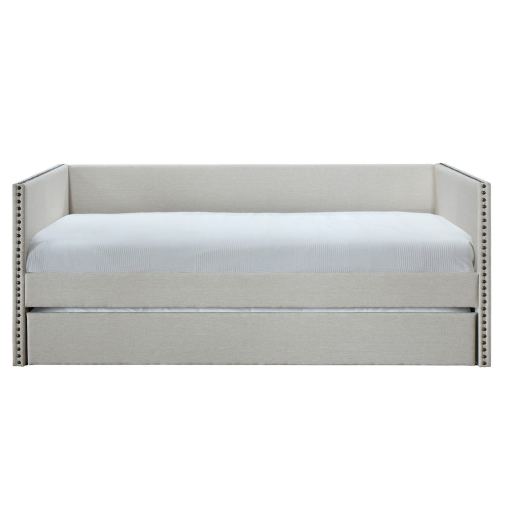 Luxuriously crafted, the Queens Daybed blends modern silhouettes with classic details. Accented with oil rubbed bronze nail head trim, this elegant daybed offers timeless sophistication and ultimate comfort. Perfect for hosting extra guests, it features a convenient pull out trundle all wrapped in luxurious grey or beige linen-blend fabric. Transform your space with our Queens Daybed.