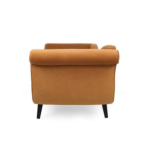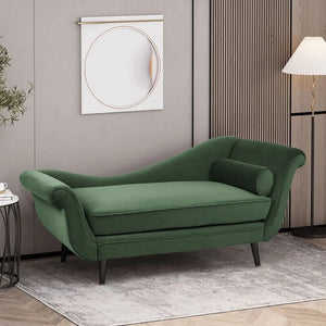 The Modern Chaise Lounge will add a touch of modern luxury to any bedroom or living room. Its recessed backrest, scrolled arms, and black wooden legs create an elegant silhouette, while splayed tapered legs add a contemporary edge. Perfect for creating an inviting space. Customize to your choice of colour!