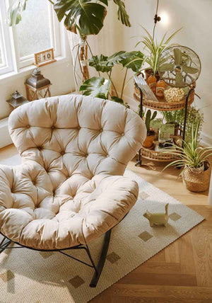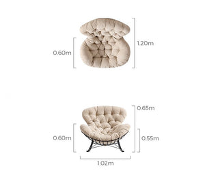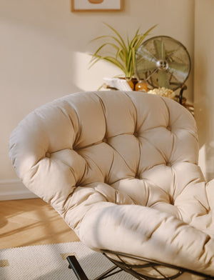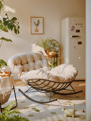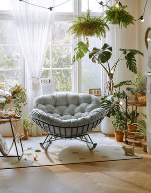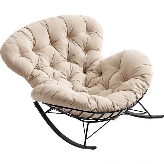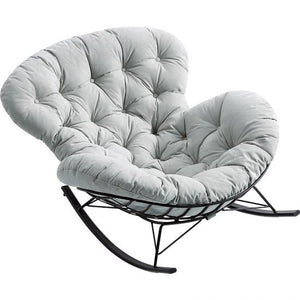 Unwind in our stunning Samana nordic contemporary rocking chair. Made for durability and ultimate comfort. The iron frame gives this a sturdy base, but the velvet suede fabric stuffed with goose feather and cotton makes this uber soft and comfy.