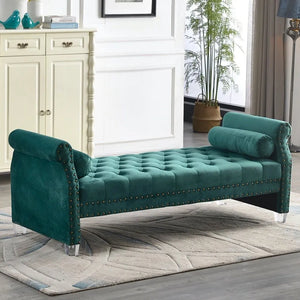 Experience the luxe of the Slater Velvet Upholstered Bench - a beautiful piece of furniture crafted with tufted detailing, nailhead trim accents and shimmering sequin upholstery. Timelessly elegant, this velvet bench will add opulence to any room, while the acrylic legs bring a stylish modern twist. Perfect for creating a glamorous focal point in the bedroom, living room or walk-in closet.